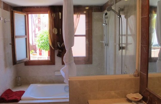 En suite Bad direkt am Schlafzimmer mit Badewanne, zusätzlicher separater Duschkabine neben der Wanne und Doppelwaschtisch, Bidet und Toilette